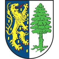 Von Blau und Silber gespalten, rechts in von goldenen Schindeln bestreutem Feld ein linkshingewendeter rotbezungter und -bewehrter goldener Löwe, links eine bewurzelte grüne Tanne.