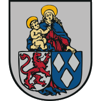 In Silber eine goldnimbierte Gottesmutter mit dem ebenfalls goldnimbierten Kind auf dem Arm, in roten Unter- und blauem Obergewand, zwei Wappenschilde haltend, rechts in Silber ein linksgewendeter roter Löwe, links in Blau drei silberne Rauten