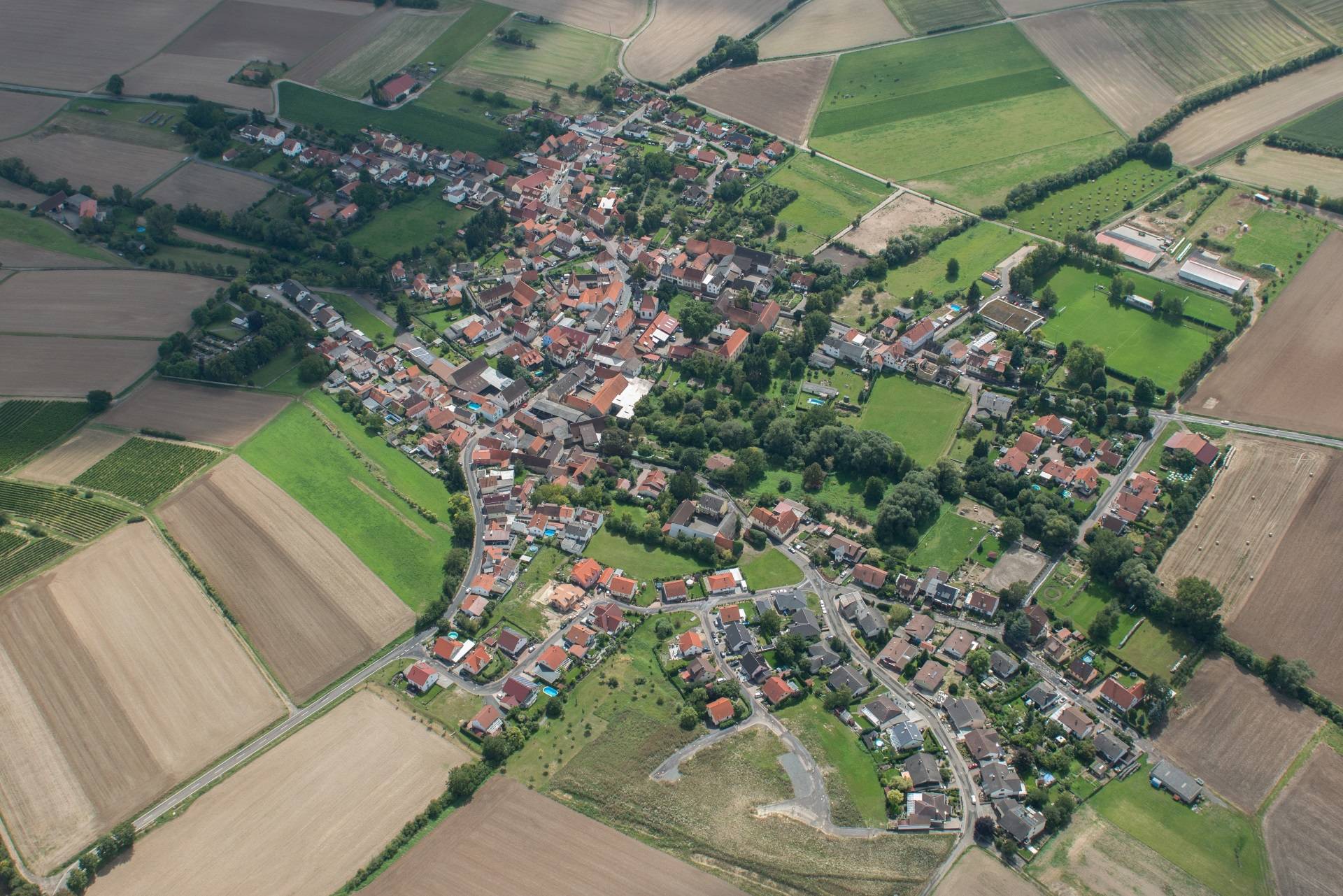 Vom Hohen Berg mit seinen Reben sind wir schon fast ganz hinuntergestiegen ins Tal des Leiselsbachs. Vor uns der Ortskern mit der evangelischen Kirche. Davor, in Fachwerk, das hübsche Dorfgemeinschaftshaus und weiter rechts das Laub des Riesenbaumes aus dem Hof des "Schlosses". Hinten, auf bereits wieder ansteigendem Gelände, eines der Neubaugebiete.