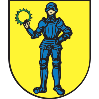 In Gold ein Ritter in blauem Harnisch, die Linke in der Hüfte gestützt, in der Rechten ein grünes Kränzlein haltend.